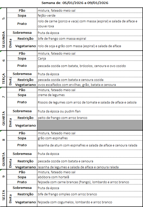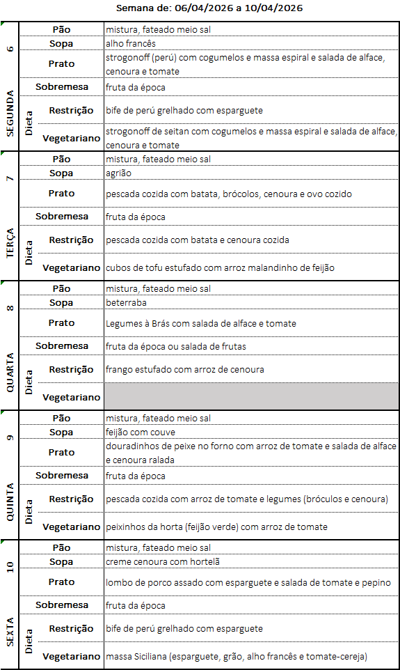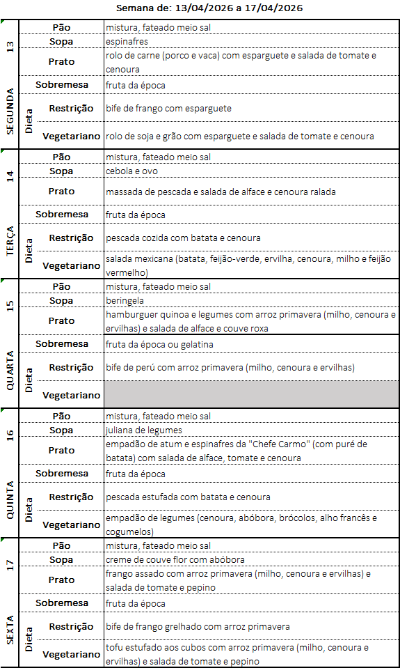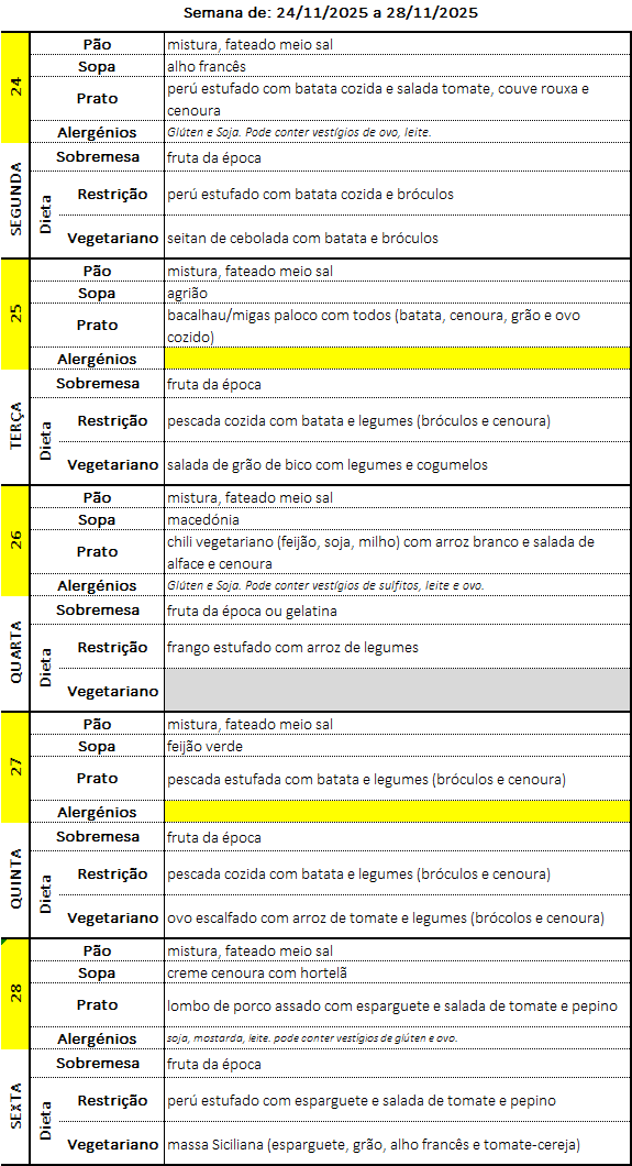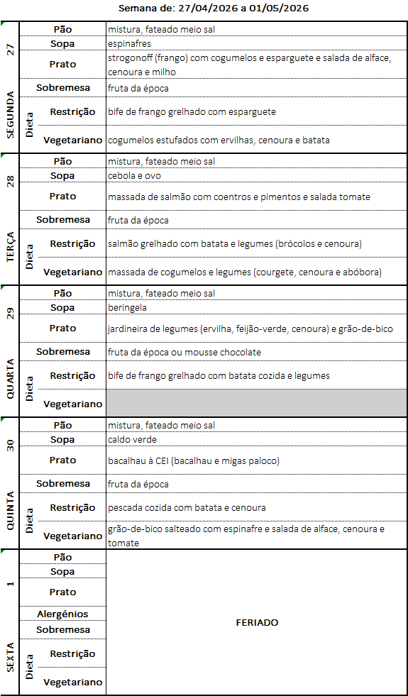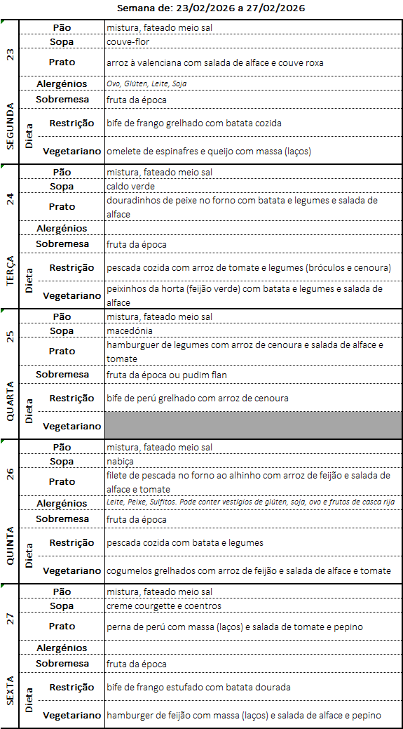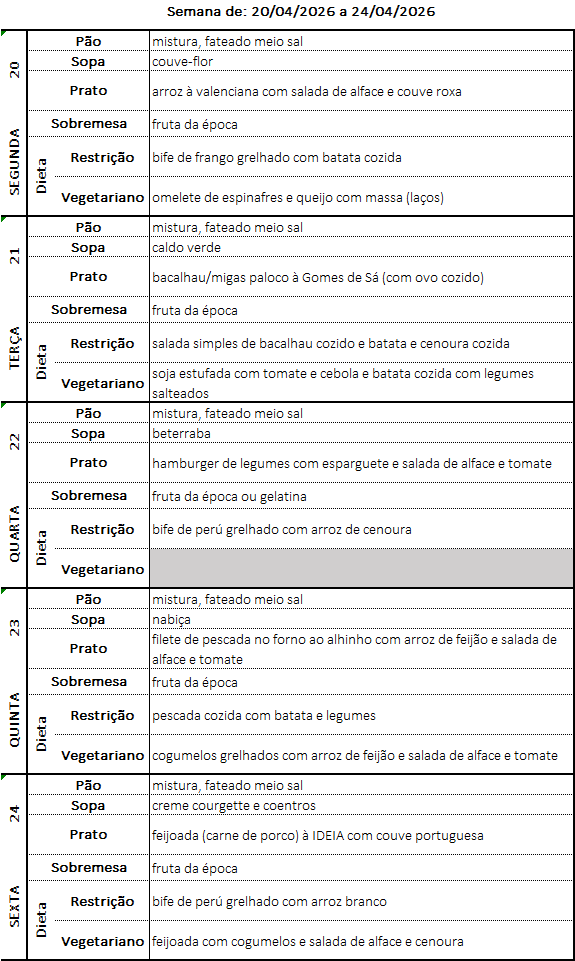 NOTA:A EMENTA pode sofrer alterações por motivos alheios à vontade da Instituição, nomeadamente indisponibilidade momentânea de matéria prima.